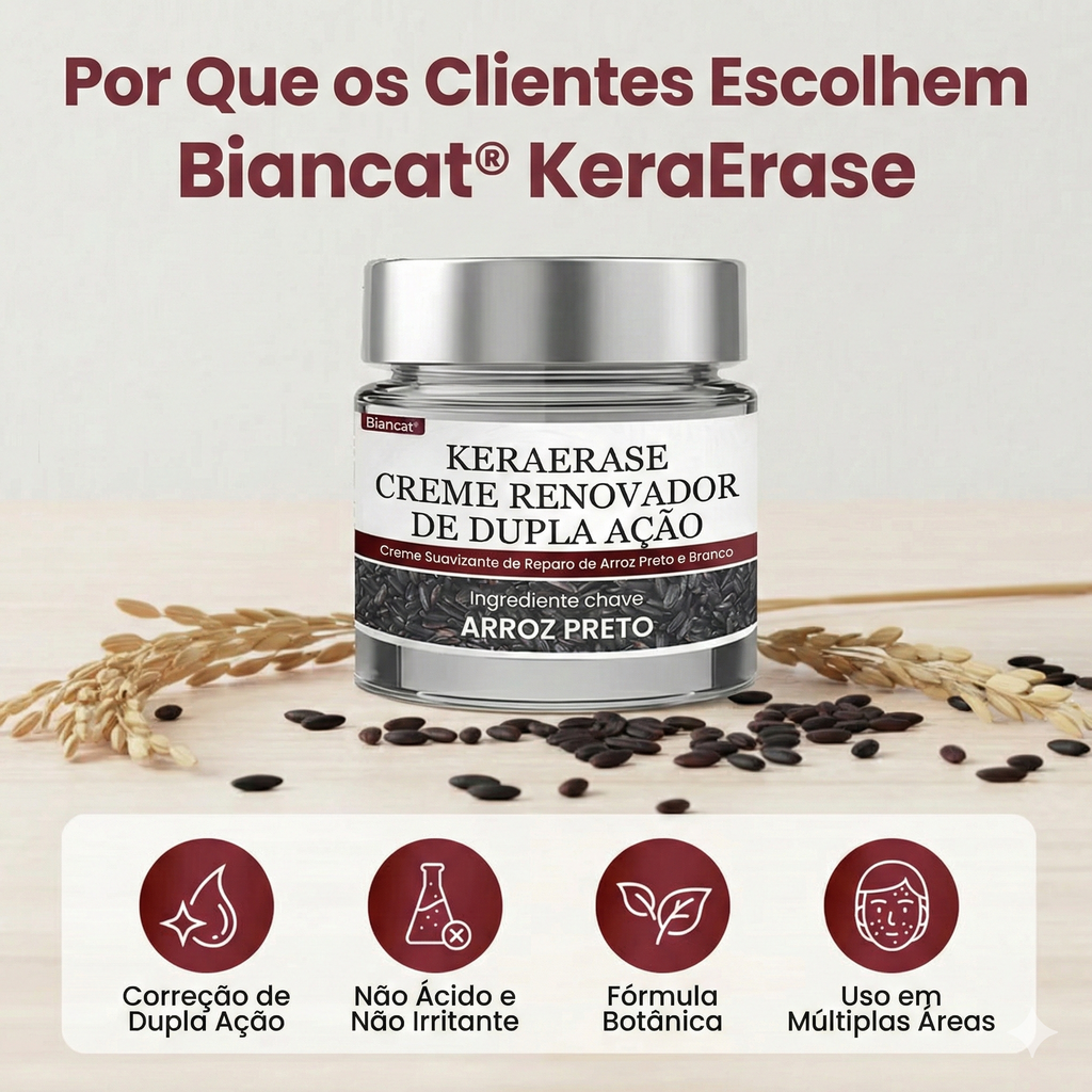 O Biancat® KeraErase é um creme removedor de verrugas desenvolvido para agir diretamente na área, ajudando a reduzir a verruga gradualmente e melhorar visivelmente o aspecto da pele com o uso contínuo — sem complicação, sem ritual demorado.